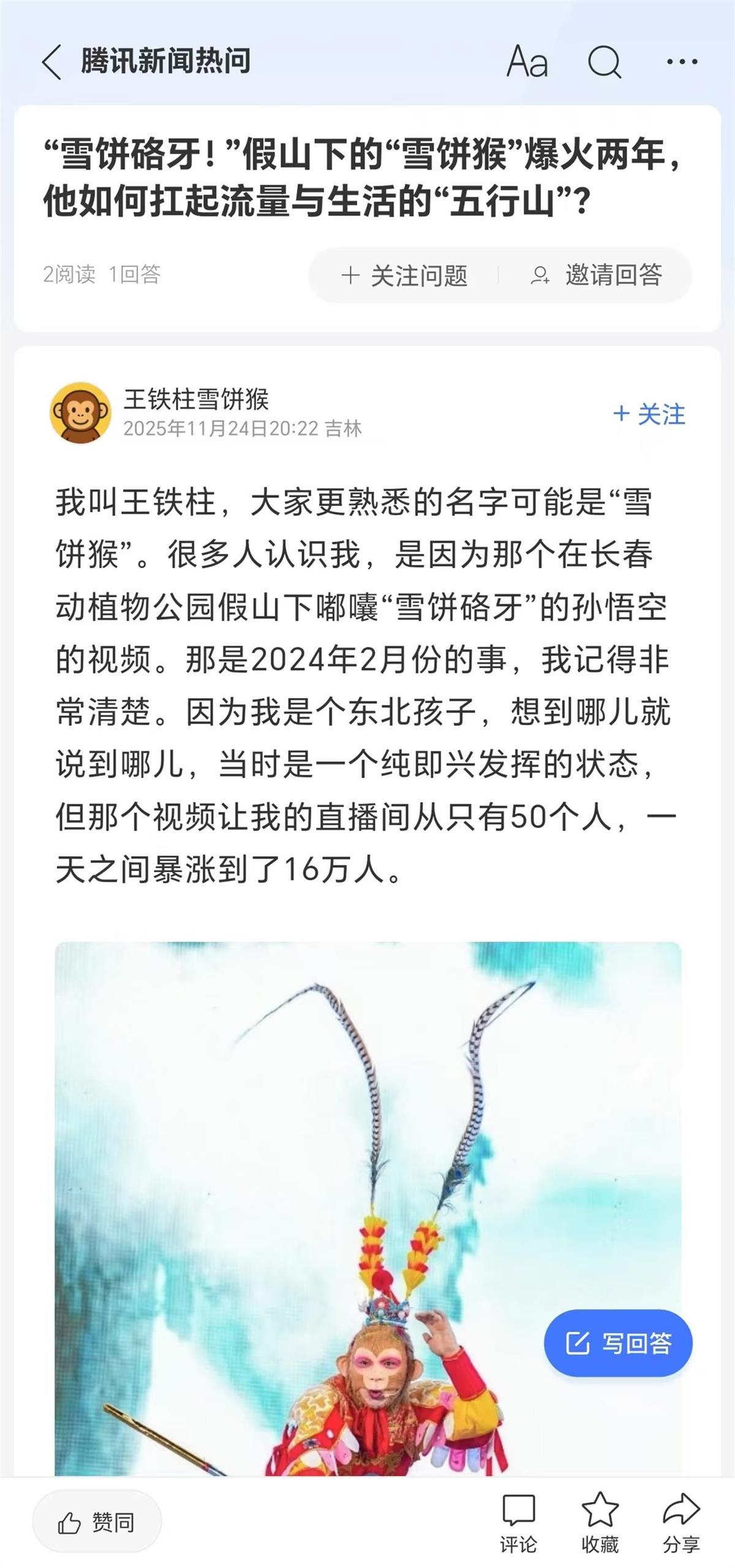 “雪饼猴”的走红,始于去年2月的一段爆火视频。当时,作为长春动植物园的NPC(非玩家角色),东北孩子王铁柱扮演一只龇牙咧嘴的“美猴王”,在假山下嘟囔着“雪饼硌牙”。视频在网上走红后,网友亲切地称王铁柱为“雪饼猴”。自此,长春动植物园最火IP横空出世。11月24日,“雪饼猴”的扮演者——演员王铁柱在腾讯热问发帖,分享了他爆火两年来,是如何扛起流量与生活这座“五行山”的。同时,王铁柱也接受极目新闻记者专访,讲述自己从一个景区NPC成长为长春动植物园台柱子的历程。