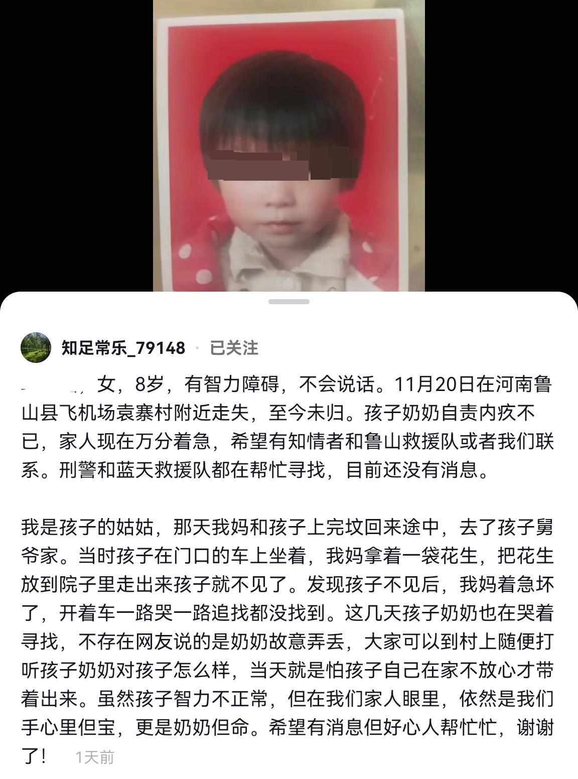 事发后,许多网友指责孩子的奶奶看护不当。孩子的姑姑24日曾发文回应:“那天我妈和孩子上完坟回来途中,去了孩子舅爷家。当时孩子在门口的车上坐着,我妈拿着一袋花生,把花生放到院子里走出来孩子就不见了。发现孩子不见后,我妈急坏了,开着车一路哭一路找都没找到。这几天孩子奶奶也在哭着寻找,不存在网友说的是奶奶故意弄丢,当天就是怕孩子自己在家不放心才带着。”