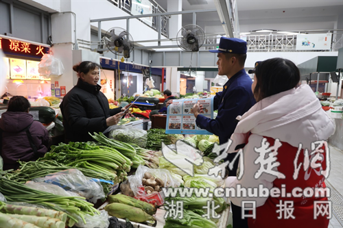 消防与社区人员深入农贸市场,开展消防宣传并发放海报。通讯员 魏欢欢 摄
