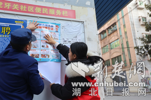 消防与社区人员在社区宣传栏张贴消防海报。通讯员 魏欢欢 摄