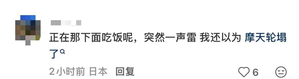 极目新闻记者注意到,多位身处日本大阪的华人在社交平台表示,25日晚的雷电令人害怕。有人回忆:“当时正在摩天轮下用餐,突然一声巨雷,我还以为摩天轮塌了。”也有网友称:“昨天的雷电实在太可怕,完全被吓到了。”