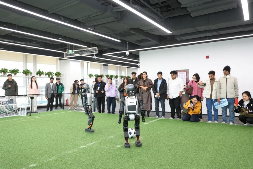 在中原异构人形机器人训练场,一场人与机器的精彩互动正在上演。