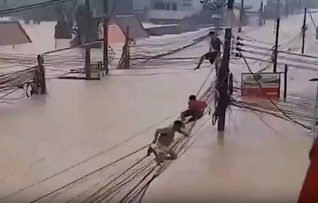 当地不少民众只能爬上屋顶,甚至是在电线上“走钢丝”求援。图片来源:海客新闻