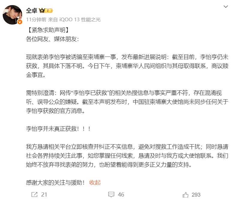 仝卓表弟的母亲也通过微博账号“单亲妈妈柬埔寨救子”确认了此消息。她在长文中介绍,儿子李怡亨在今年11月13日外出工作后失去联系。直到现在一家人都无法确认他的真实状况。