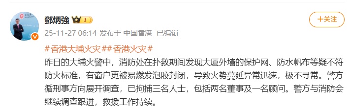 香港保安局局长邓炳强在个人微博发文:昨日的大埔火警中,消防处在扑救期间发现大厦外墙的保护网、防水帆布等疑不符防火标准,有窗户更被易燃发泡胶封闭,导致火势蔓延异常迅速,极不寻常。警方循刑事方向展开调查,已拘捕三名人士,包括两名董事及一名顾问。警方与消防会继续调查跟进,救援工作持续。