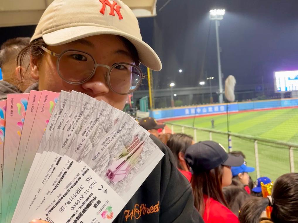 11月20日,一名观众在全运会棒球比赛现场展示自己的票根。新华社记者霍思颖 摄