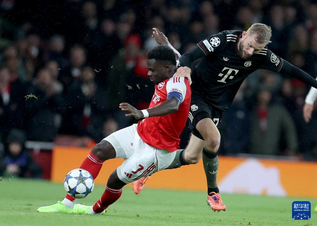 11月26日,阿森纳队球员萨卡(左)与拜仁慕尼黑队球员莱默尔拼抢。