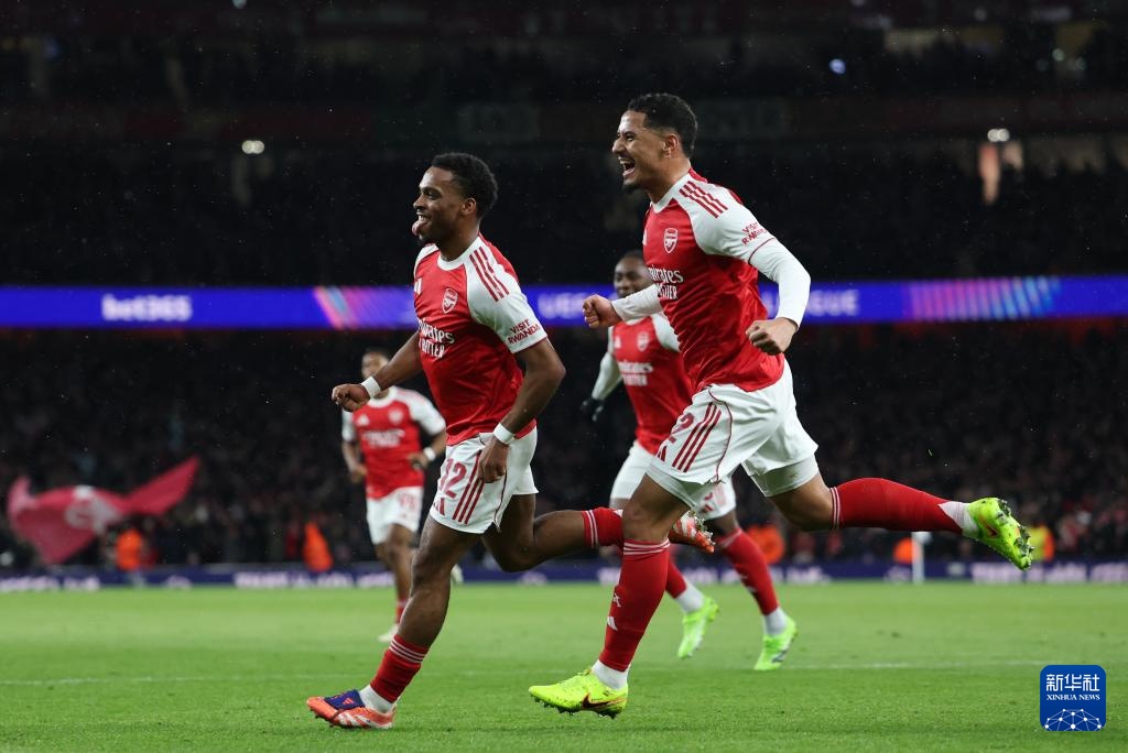 11月26日,阿森纳队球员马杜埃凯(右)进球后与队友埃泽庆祝。
