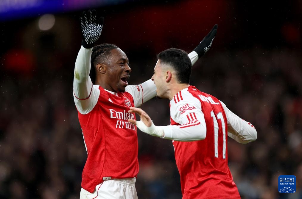 11月26日,阿森纳队球员马丁内利(右)进球后与队友埃泽庆祝。