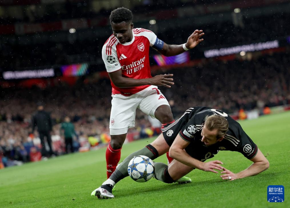 11月26日,阿森纳队球员萨卡(上)与拜仁慕尼黑队球员凯恩拼抢。