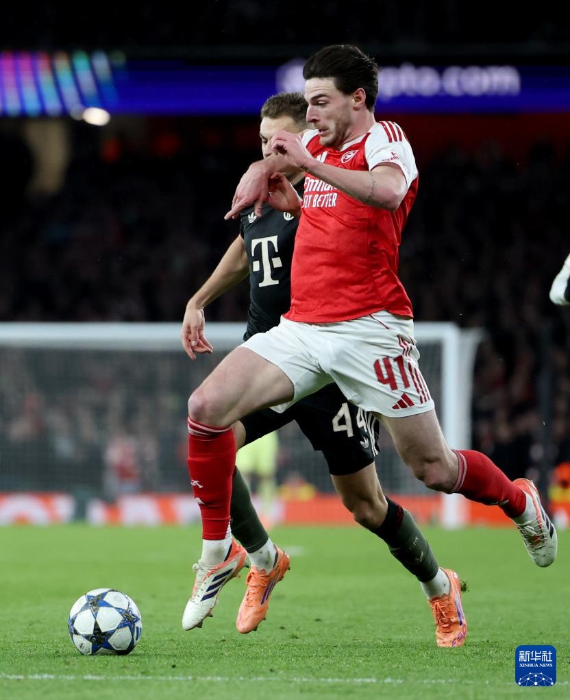 11月26日,阿森纳队球员赖斯(右)与拜仁慕尼黑队球员斯塔尼希奇拼抢。
