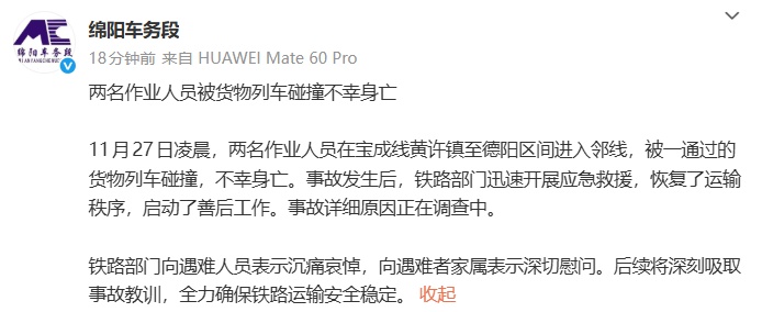 11月27日,@绵阳车务段 发文回应“两名作业人员被货物列车碰撞不幸身亡”。