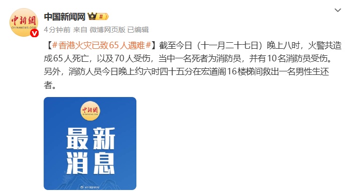 据中国新闻网,截至今日(11月27日)晚上八时,火警共造成65人死亡,以及70人受伤,当中一名死者为消防员,并有10名消防员受伤。 另外,消防人员今日晚上约六时四十五分在宏道阁16楼梯间救出一名男性生还者。