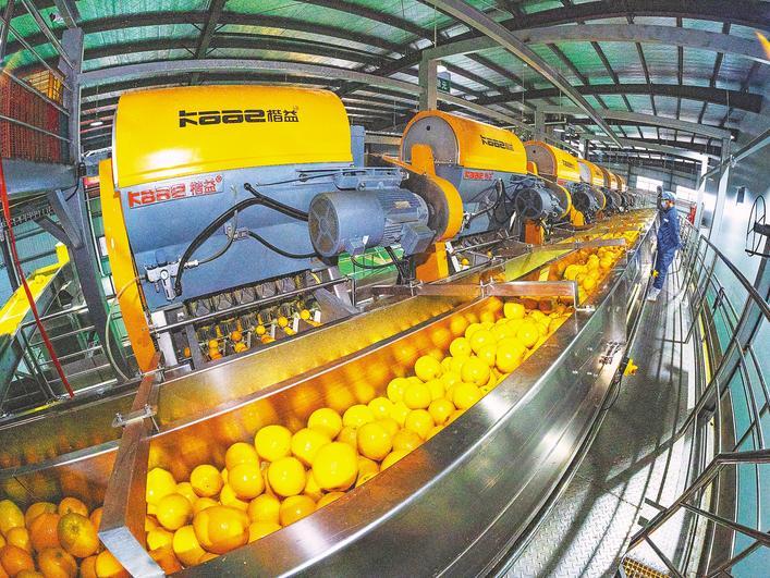 11月23日,秭归县茅坪镇溪口坪村的宜昌市果乐迪食品有限公司NFC果汁加工项目正式投产运行。该项目作为秭归县脐橙重点深加工产业,建成达产后可年加工鲜果1.5万吨,消化脐橙6万吨以上,预计年综合产值达1.5亿元。(视界网 彭强 摄)