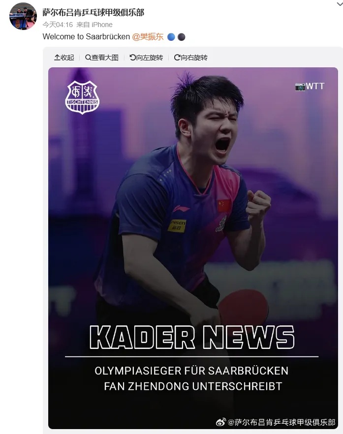 此前6月1日,萨尔布吕肯俱乐部宣布樊振东加盟德甲联赛。