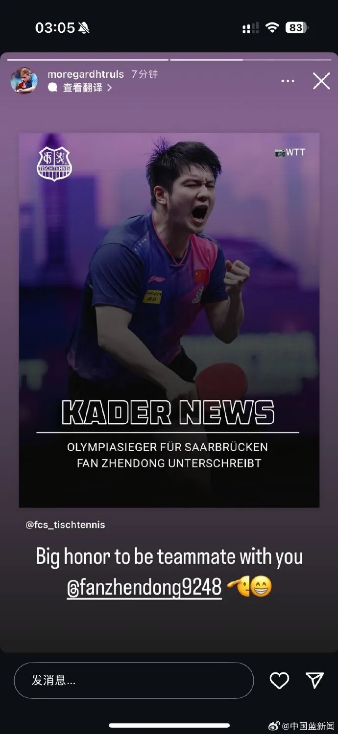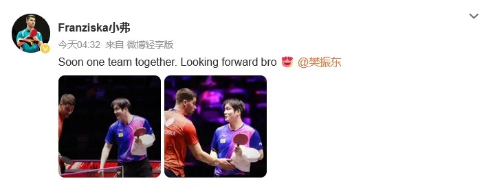 弗朗西斯卡和莫雷加德转发欢迎樊振东,很高兴大家成为队友。