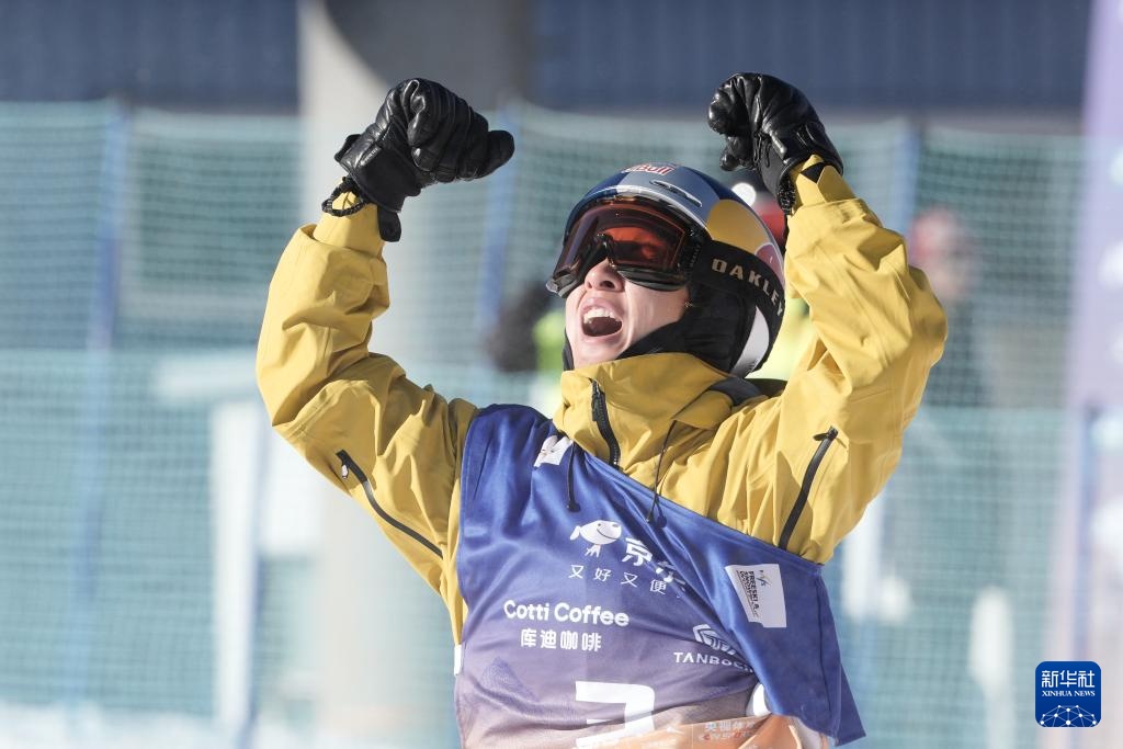 11月27日,中国选手葛春宇在单板滑雪男子大跳台资格赛中庆祝晋级。