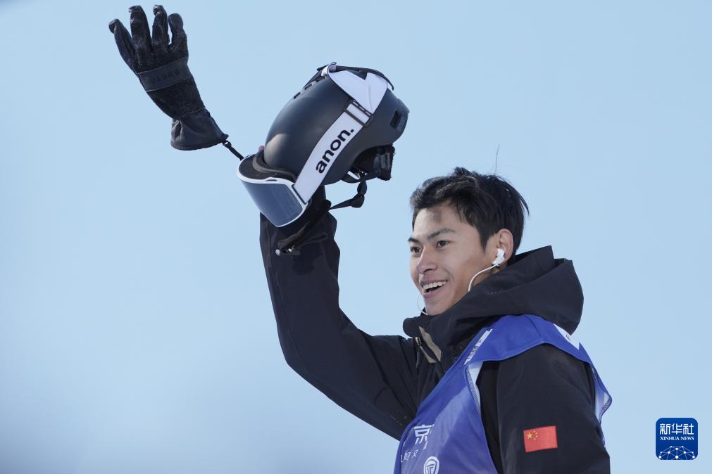 11月27日,中国选手苏翊鸣在单板滑雪男子大跳台资格赛中庆祝晋级。