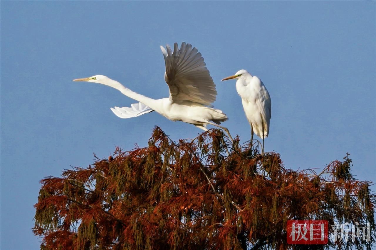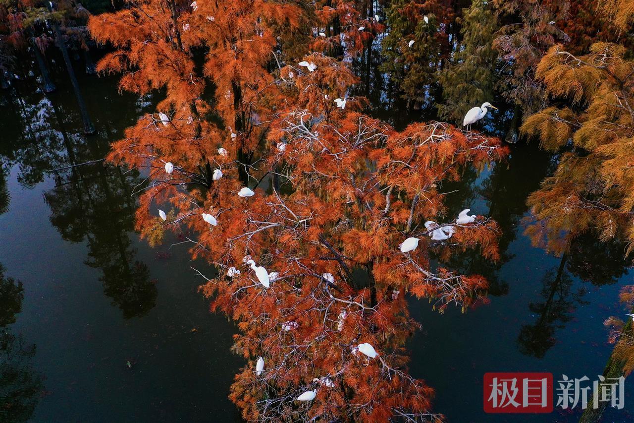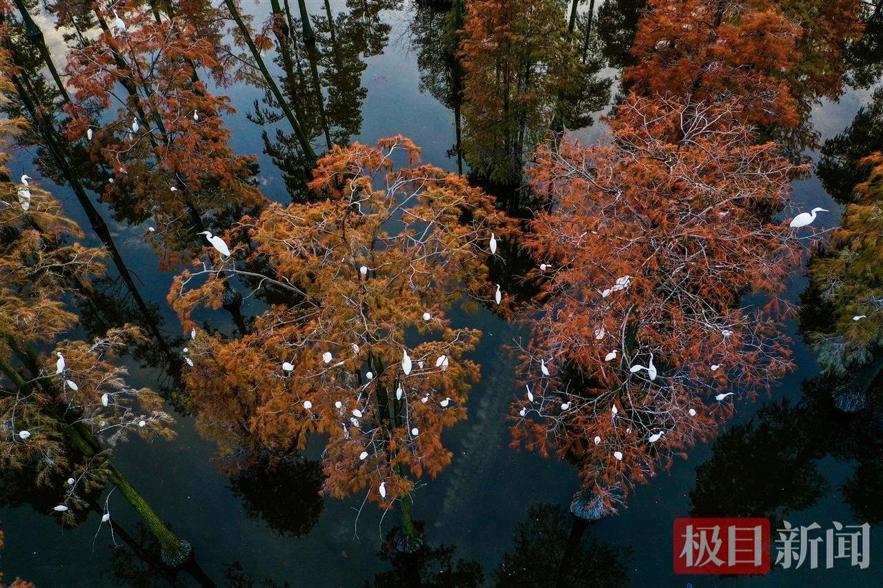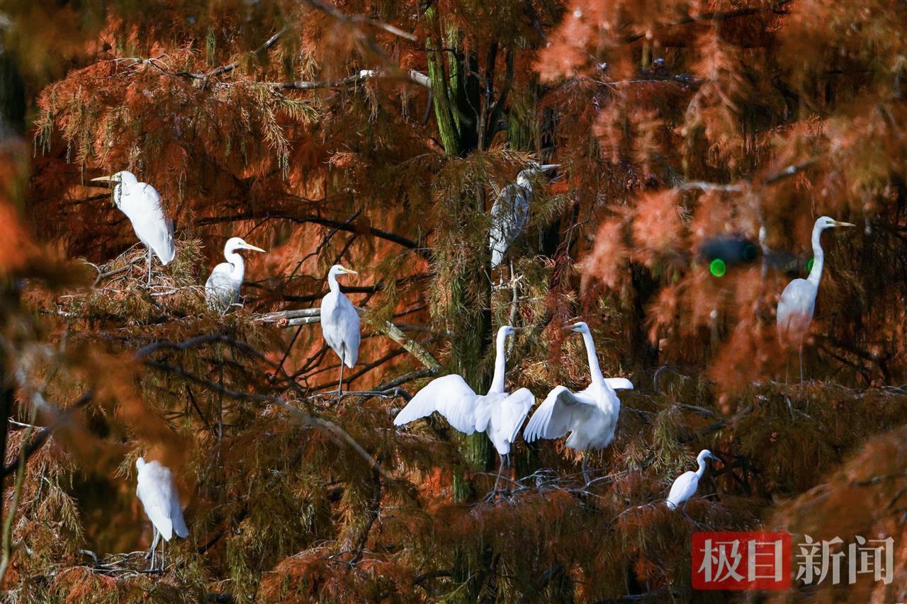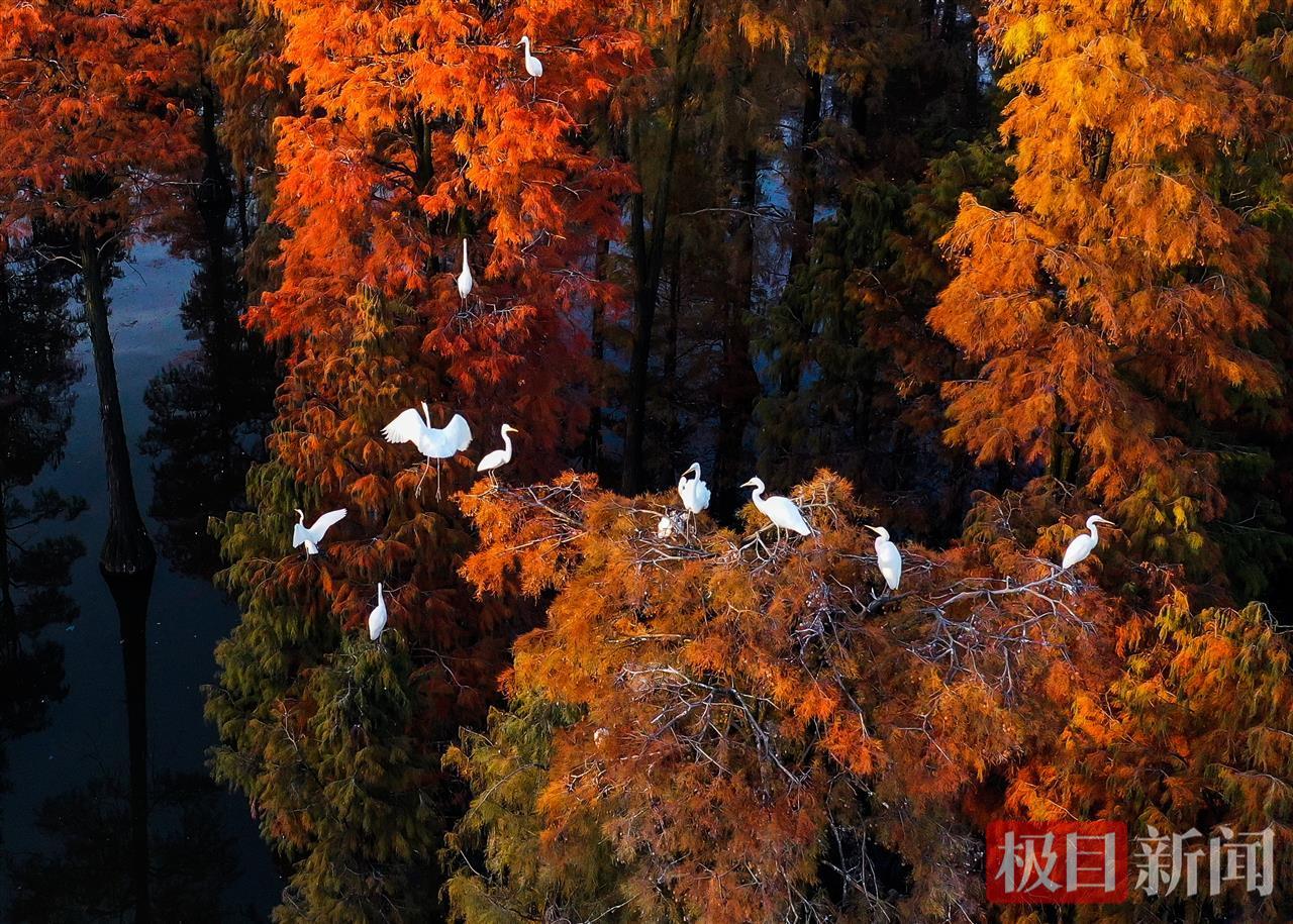11月27日,武汉市新洲区涨渡湖水上森林公园,300亩树叶深红的池杉林中,万余只鹭鸟穿梭其中追逐玩耍,嬉戏觅食,形成一道“林鸟相依”的独特生态美景。眼下正是候鸟南迁越冬时节,为何这里的鹭鸟在此流连忘返?据新洲区园林和林业局相关人员介绍,近年来,由于生态保护和修复力度加大,鹭鸟栖息的生态环境、食物资源、气候条件日益改善,使得湿地一定数量的白鹭、苍鹭等夏候鸟不愿南飞,变身留鸟,成为湿地的“常住户”。