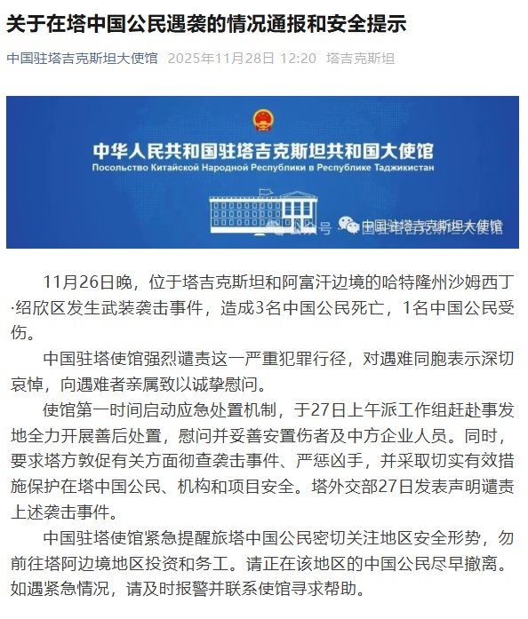 11月28日,中国驻塔吉克斯坦大使馆发布《关于在塔中国公民遇袭的情况通报和安全提示》: