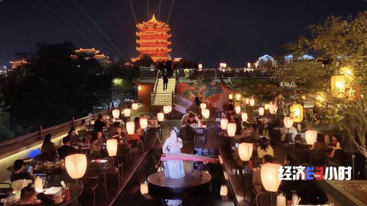 距离黄鹤楼260米,有一家以黄鹤楼为背景,开在顶楼露台上的烧烤店,2000平方米的店铺,108 张餐桌均为“观景位”。