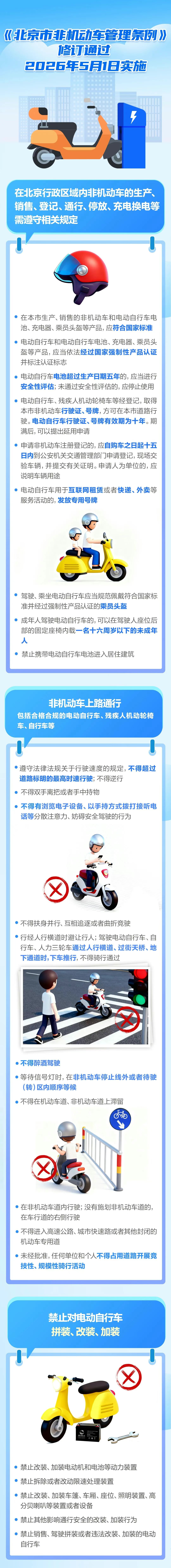强制佩戴乘员头盔、骑行时不得浏览手机及以手持方式拨打接听电话、全面禁止非法拼改加装、严禁携带电动车电池进入居住建筑等一项项关乎市民群众生命安全的措施均以立法形式明确,标志着首都非机动车管理进入更加精细化、法治化的新阶段。