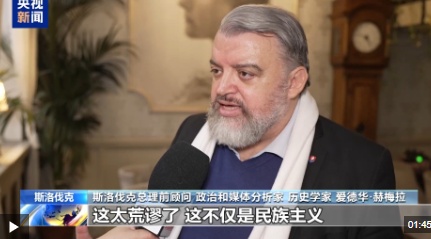 斯洛伐克总理前顾问 政治和媒体分析家 历史学家 爱德华·赫梅拉:这太荒谬了,这不仅是民族主义,更是法西斯主义倾向的复苏。这种倾向在日本非常强烈,在日本,我们看到军国主义正在抬头,令人非常不安。我认为国际社会,应该明确反对这种趋势。日本出现民族主义势力掌权的情况,实在非常危险。