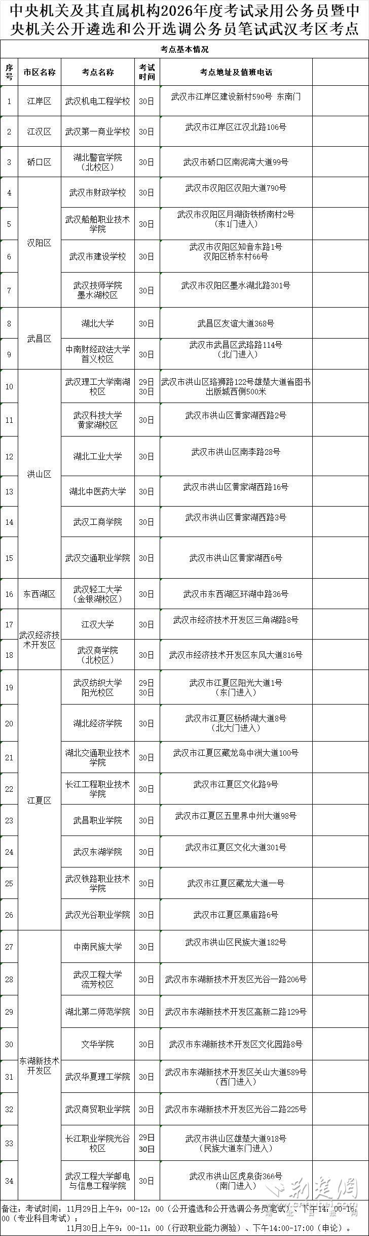 荆楚网(湖北日报网)讯(通讯员 李佳、苏黎、舒香茹、詹晓静、黄一燕)中央机关及其直属机构2026年度考试录用公务员暨中央机关公开遴选和公开选调公务员笔试将于11月29日(星期六)、30日(星期日)举行。全市有9.4万余人参加考试,考点34个,涉及江岸、江汉、硚口、汉阳、武昌、洪山、东西湖、江夏、开发区、东新等区域。因考生人数多,预计周末交通出行集中,届时江夏藏龙岛片区杨桥湖大道、藏龙大道、栗庙路等考点周边道路和武昌职业学院、湖北交通职业技术学院周边中州大道、洪山大黄家湖西路,道路交通压力将明显增大。