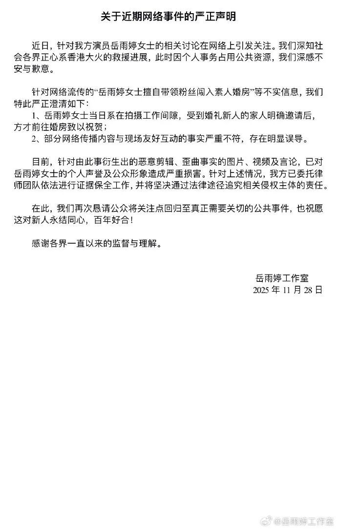 11月28日,#曝岳雨婷闯素人婚房讨喜糖# 引热议。刚刚,@岳雨婷工作室 发声明回应称岳雨婷是受到婚礼家人明确邀请后才进入婚房,网传内容与事实严重不符,已委托律师取证。