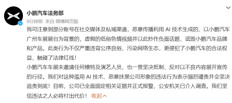 11月28日,@小鹏汽车法务部 发文称:我司注意到部分账号在社交媒体及私域渠道,恶意传播利用 AI 技术生成的、以小鹏汽车广州车展展台为背景的,虚假的低俗色情视频并以此炒作负面话题、诋毁小鹏汽车品牌和产品。此类行为不仅严重违背公序良俗,污染网络生态,更侵犯了小鹏汽车的合法权益,触碰了法律红线!