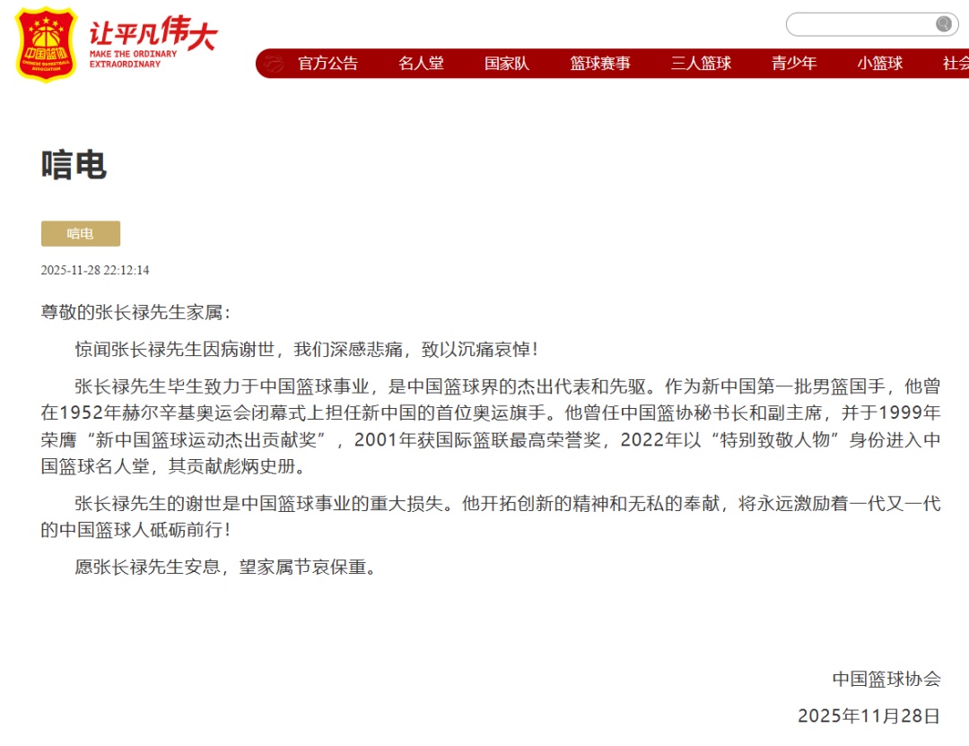 11月28日,中国篮球协会官网发布《唁电》,沉痛悼念中国篮球名宿张长禄先生。