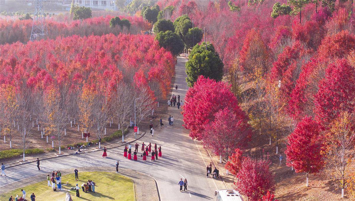 11月27日,武汉文华学院上万株红枫已变红色,在下午暖阳的照耀下,格外艳丽,红枫树下处处是拍照打卡师生及市民的身影。该校的红枫树主要分布在图书馆前的红枫大道、西南门及明湖湖畔三个区域,总面积达200多亩。秋冬时节,这里的红枫宛若“红色森林”,蔚为壮观。“春到武大看樱花,秋冬到文华看红枫。”近年来,“红枫文化节”不仅已成为该校的特色文化品牌,“文华红枫”也已成为江城武汉一道亮丽风景。(湖北日报全媒记者 朱熙勇 摄)
