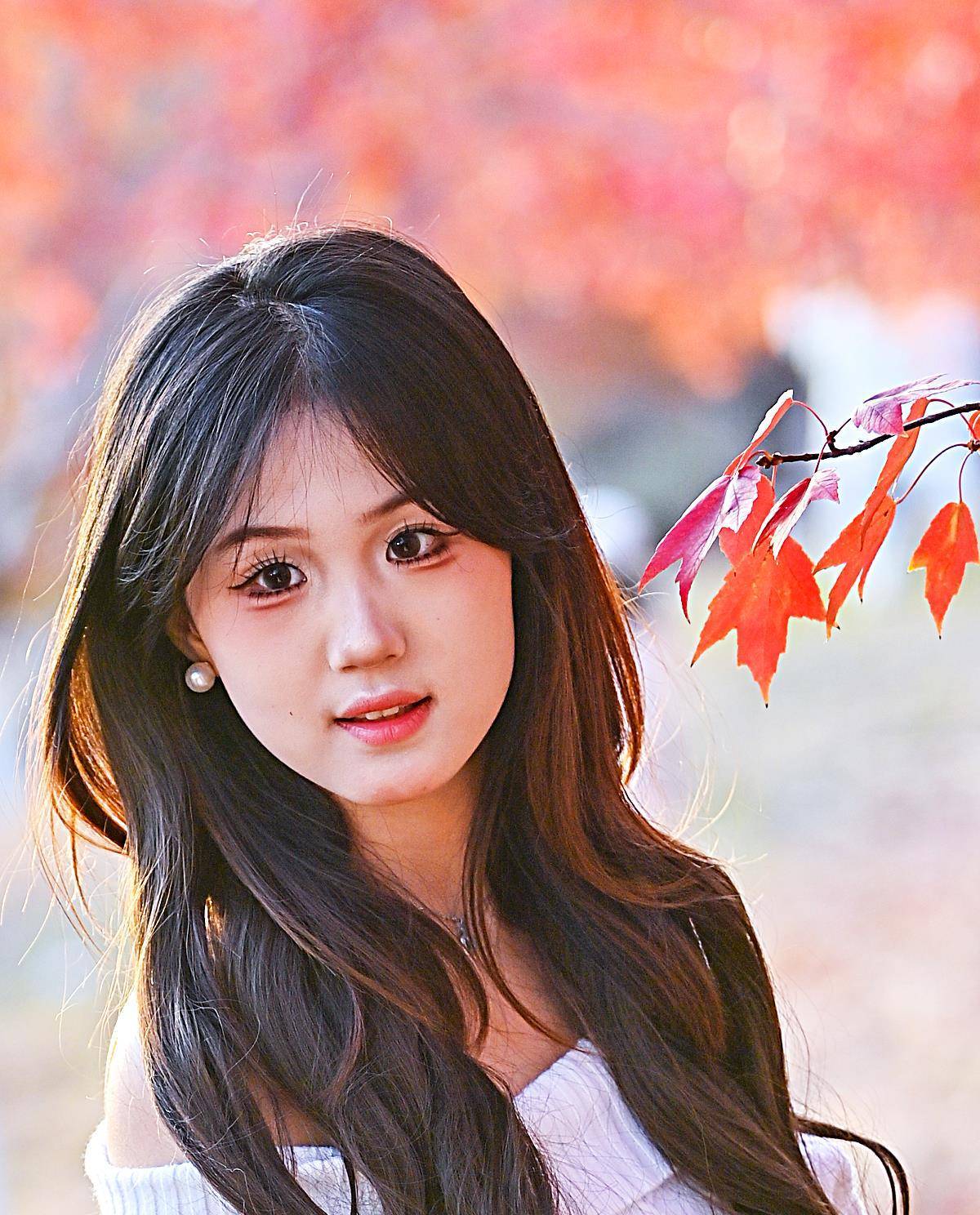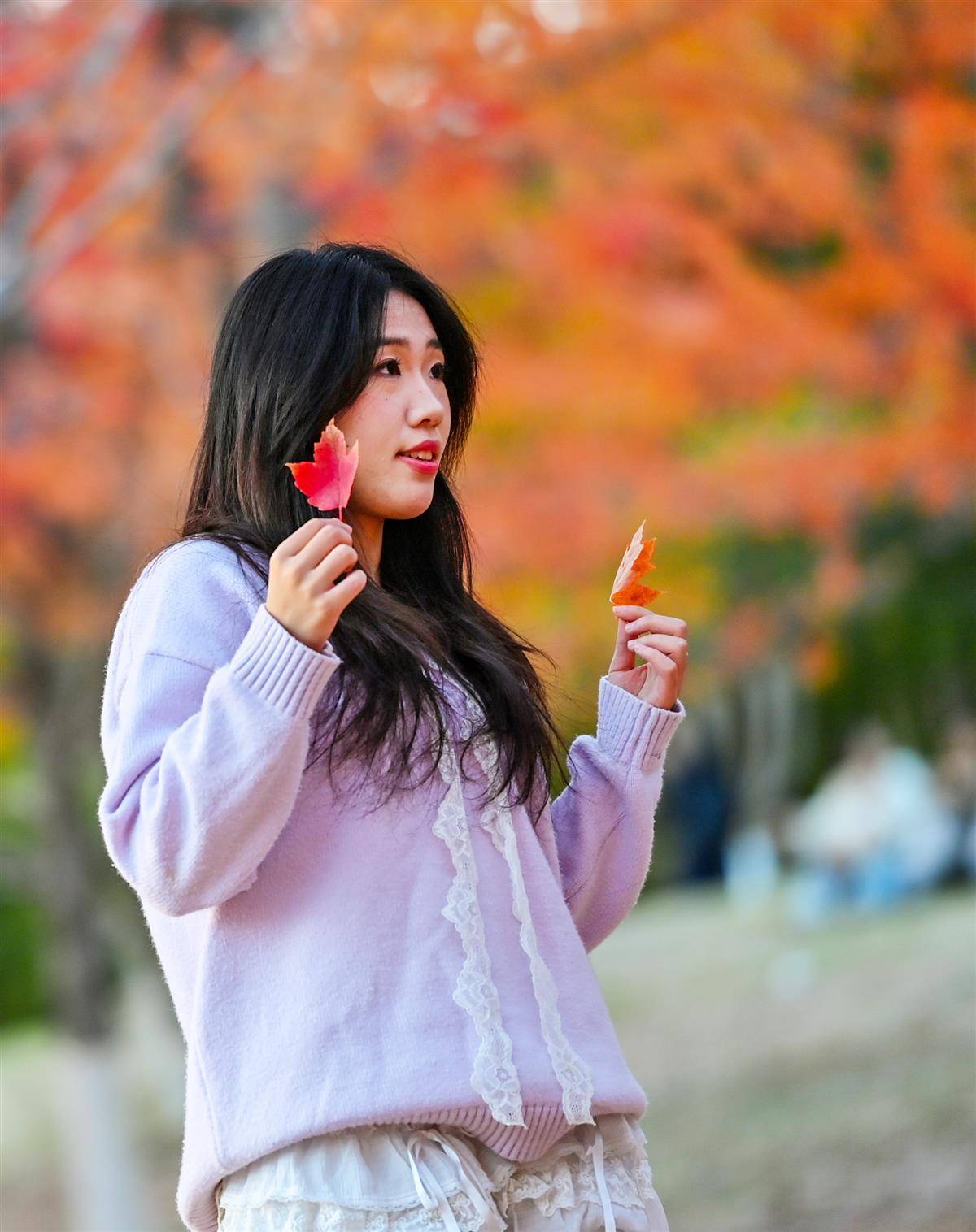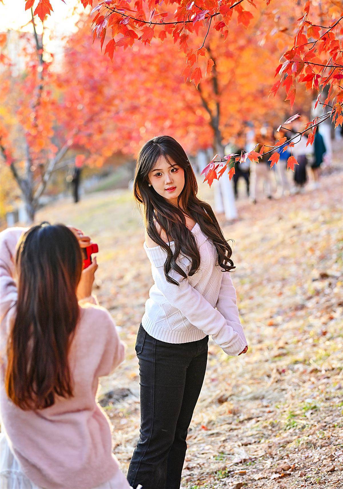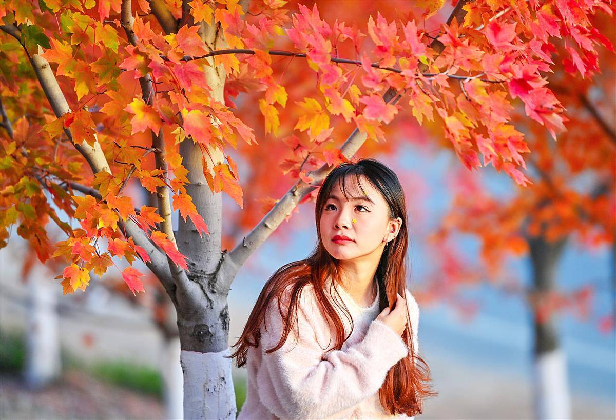 文华学院的枫叶红透了,在树下拍照打卡的美女。