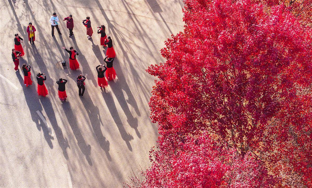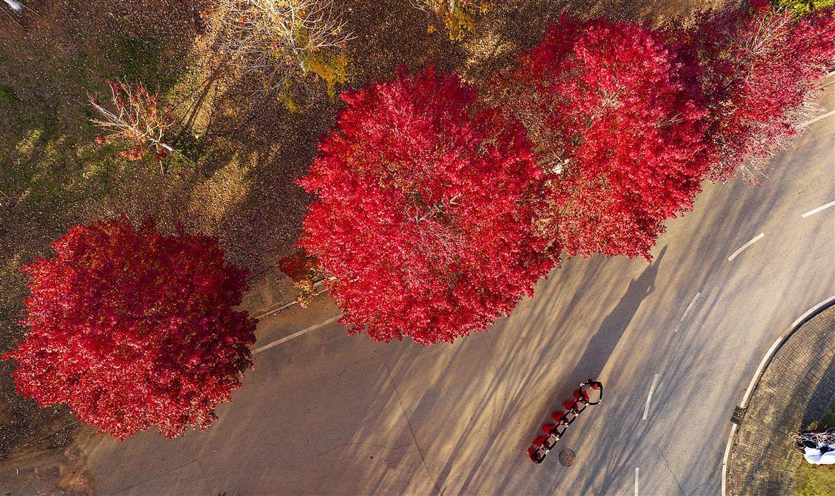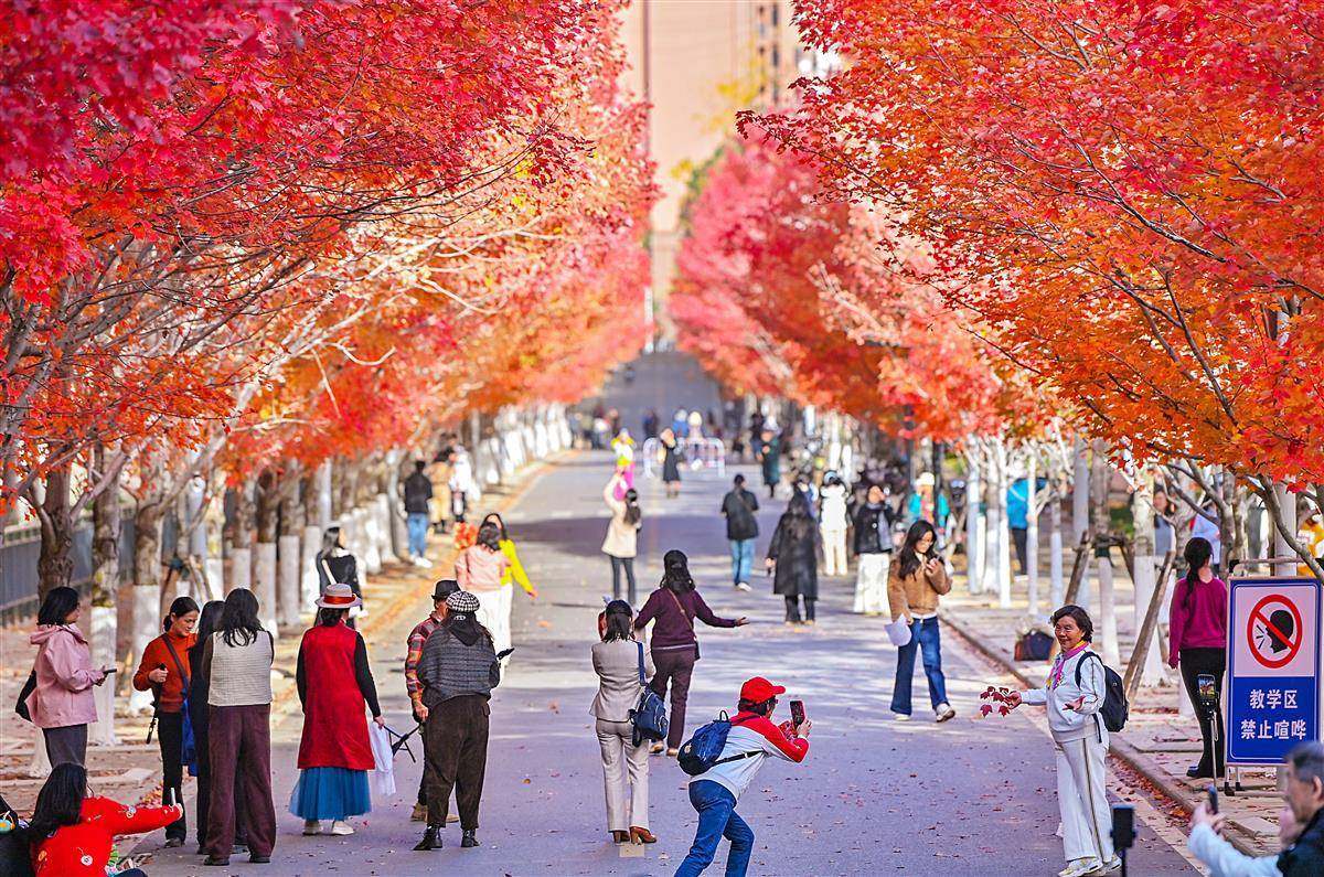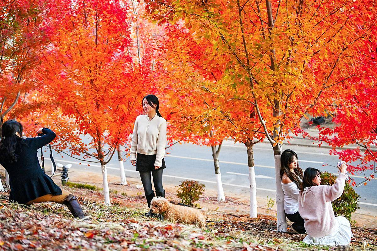 文华学院的枫叶红透了,师生和市民在树下拍照打卡。
