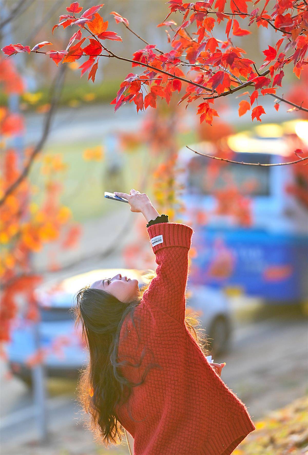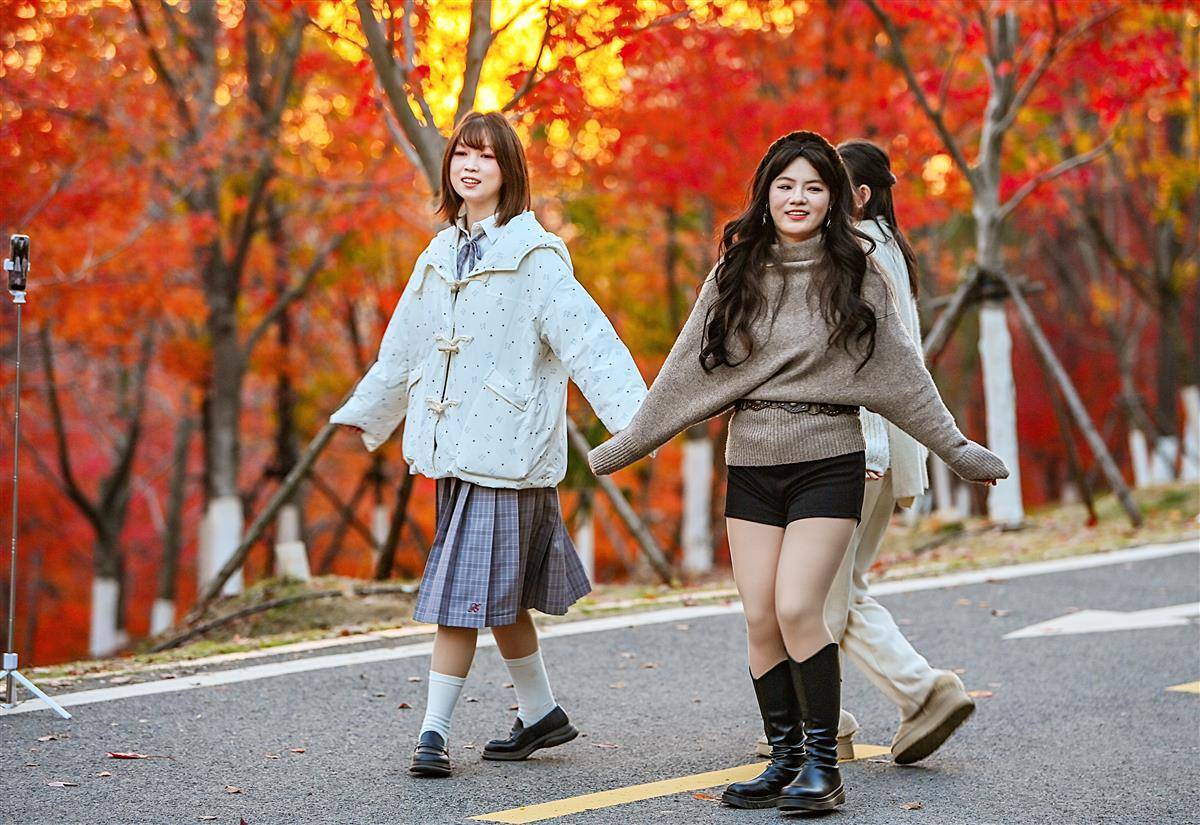 文华学院的枫叶红透了,在树下拍照打卡的学生。