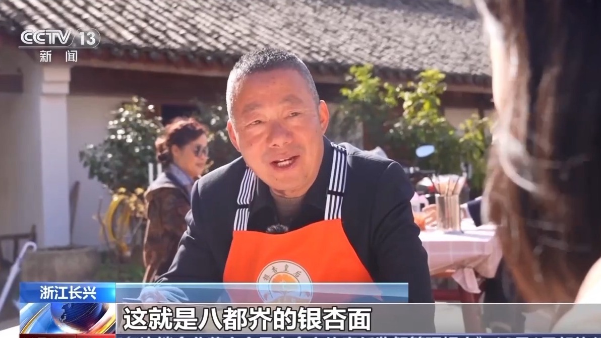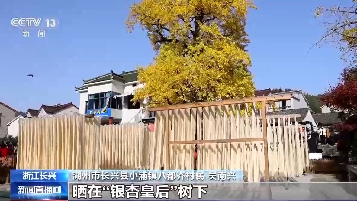 长兴县小浦镇八都岕村民 吴南兴:八都岕的银杏面,是游客来这里必打卡的一碗面。每年到白露季节的时候,我们都会在老百姓手上收银杏果,晒干再炒熟再磨成粉,这样加工出来一款银杏面。我们这个面条晒在“银杏皇后”树下,晒6个小时以上,这样晒出来的场景是相当壮观。