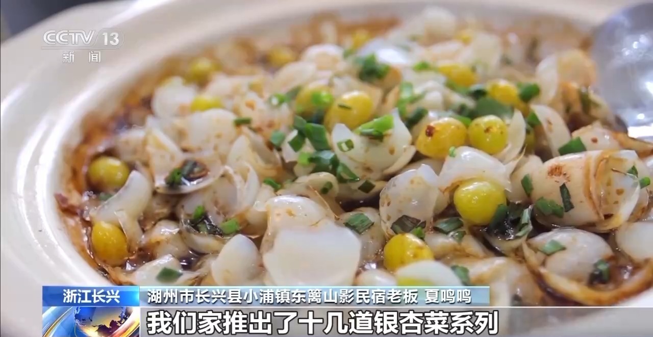 长兴县小浦镇东篱山影民宿老板 夏鸣鸣:我们家推出了十几道银杏菜系列,像银杏炖鸡、银杏肉饼这些都是必点的菜,而且客人吃后都评价比较好。吃饱喝足之后,我们还有一些有趣的手工活动。
