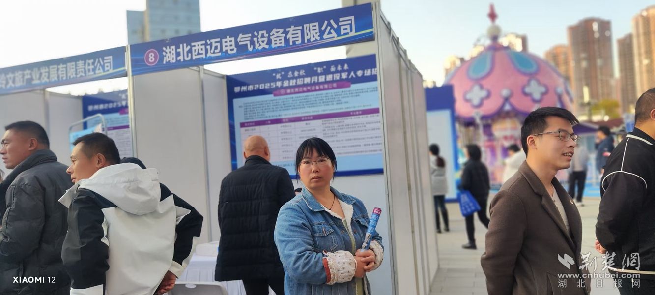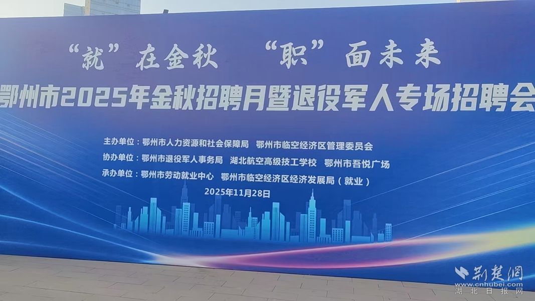 荆楚网(湖北日报网)讯 (通讯员 熊无双)11月28日下午,人气商区鄂州市吾悦广场门前人来人往,鄂州市“‘就’在金秋 ‘职’面未来”的金秋招聘月活动在此举办。