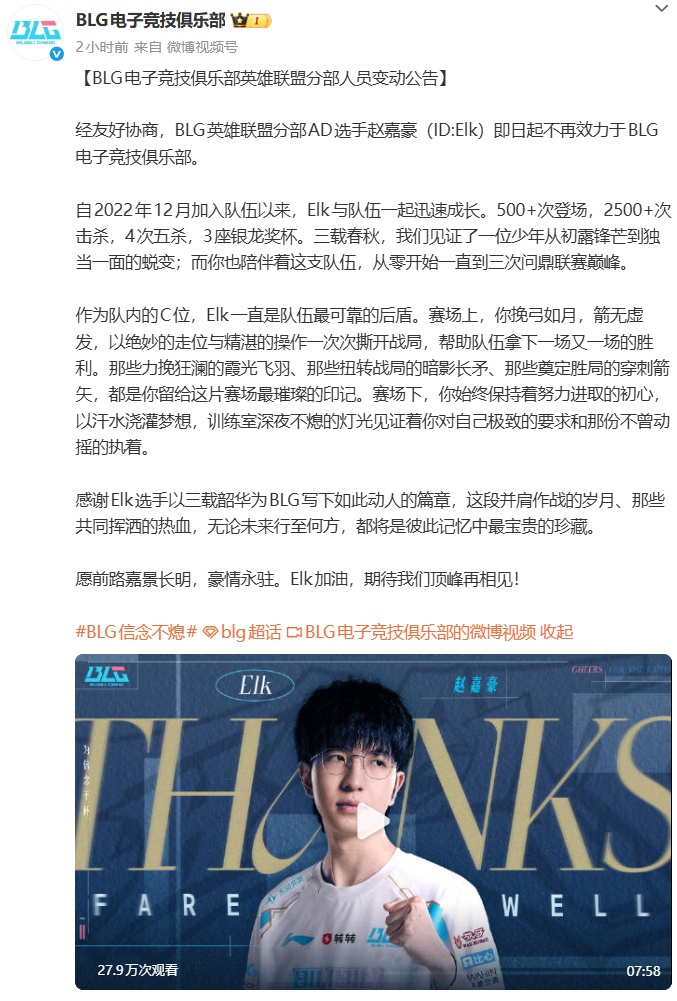 BLG电子竞技俱乐部英雄联盟分部发布人员变动公告:ADC选手赵嘉豪(ID:Elk)即日起不再效力于BLG电子竞技俱乐部。