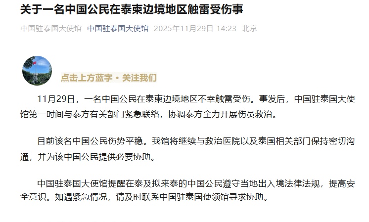 11月29日,一名中国公民在泰柬边境地区不幸触雷受伤。事发后,中国驻泰国大使馆第一时间与泰方有关部门紧急联络,协调泰方全力开展伤员救治。