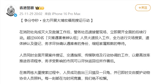 11月29日,香港警务处官方微博@香港警察 发文称,在消防处完成灭火及救援工作后,警务处迅速接管现场,立即展开全面的后续行动。超过600名“灾难遇害者辨认组”人员火速投入工作,全力进行灾场搜索、遗体辨认及登记,务求尽快确认遇难者的身份,缩短家属煎熬的等待。