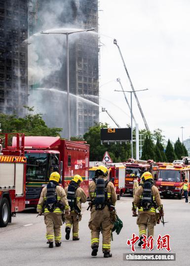 11月27日上午,消防人员持续在香港大埔宏福苑火灾现场进行救援工作。目前,部分楼宇火势得到控制。图为增援和轮替的消防员进出火灾现场。 中新社记者 侯宇 摄