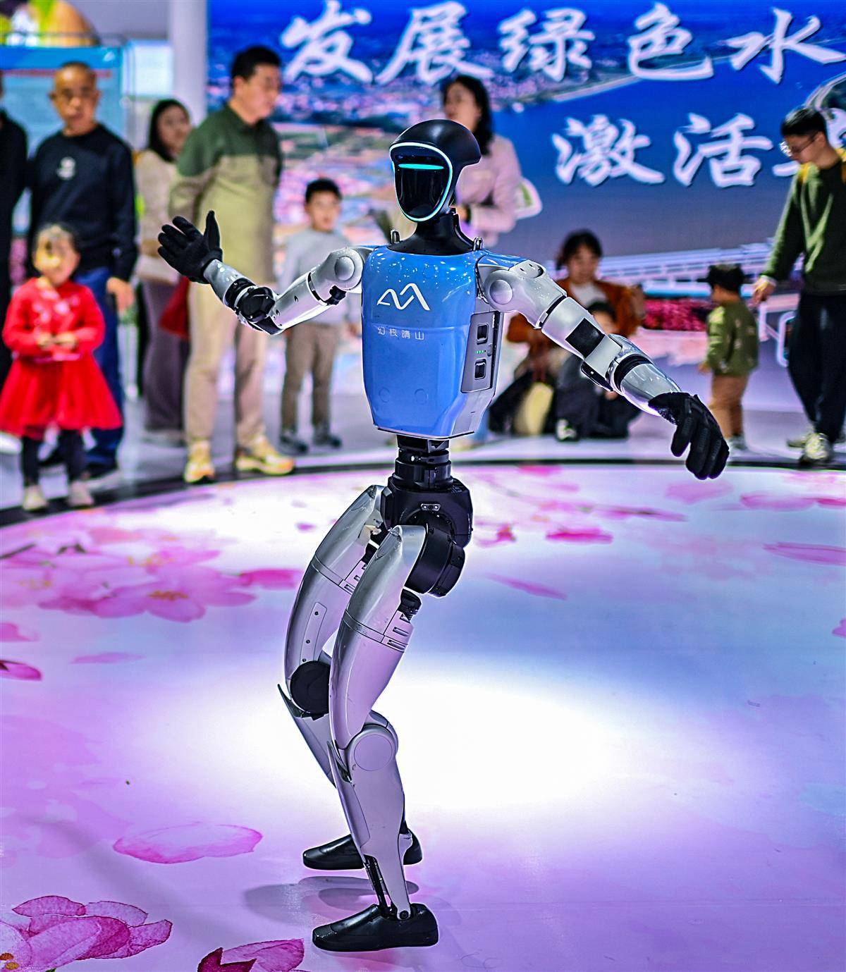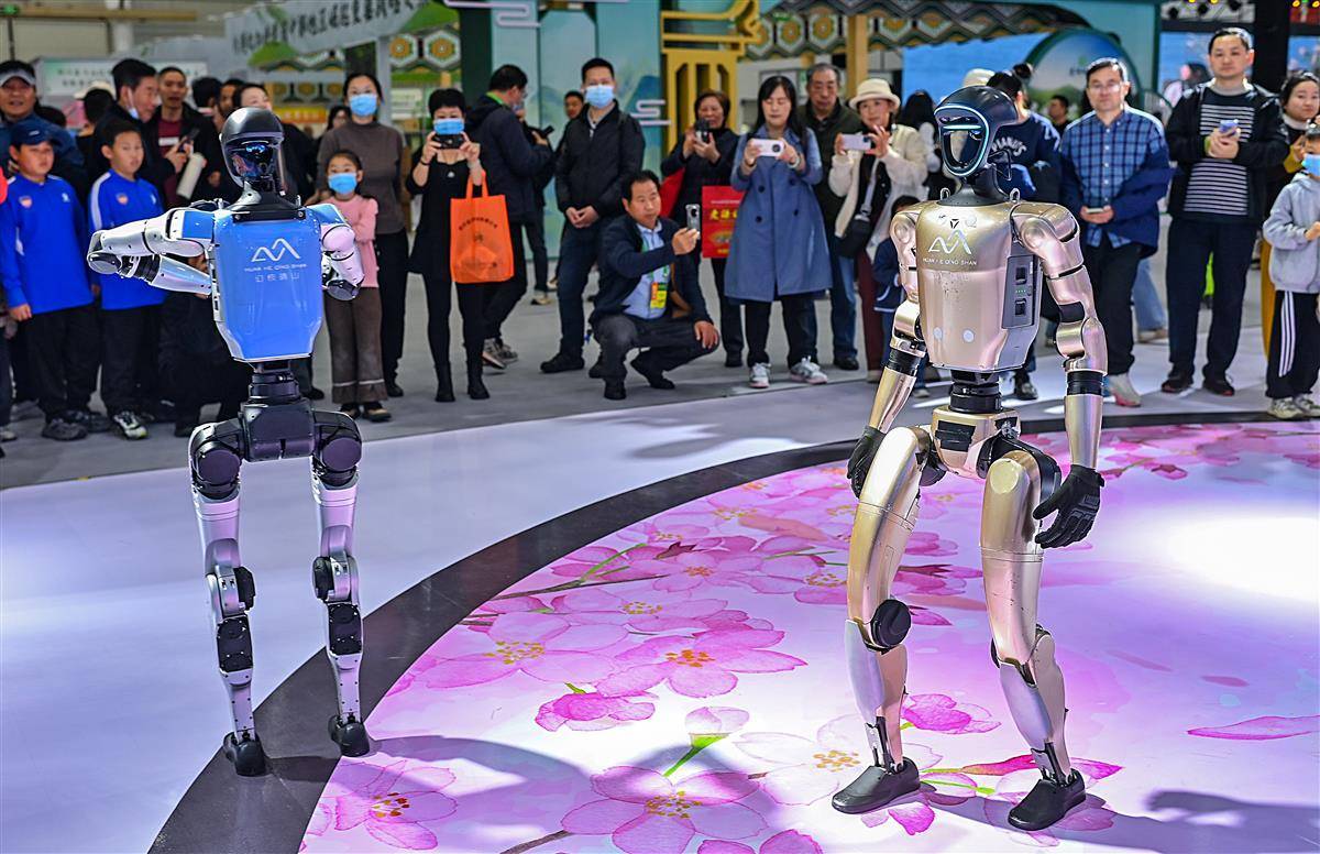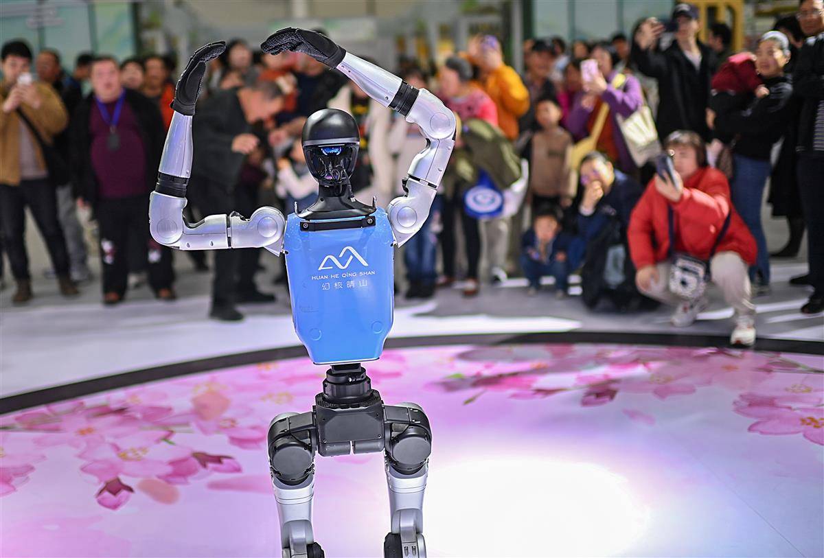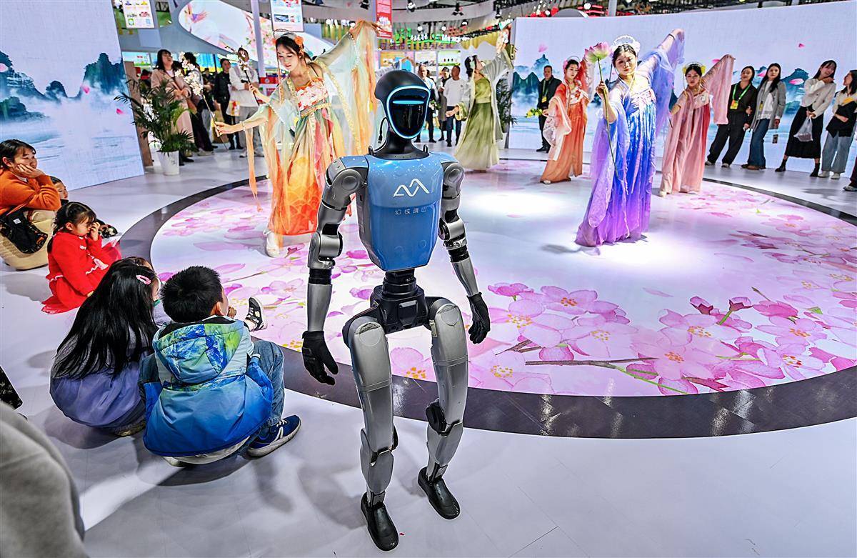 11月29日,在武汉国际博览中心(汉阳国博)举办的2025湖北农业博览会上,随州市的展区里正在举行品牌推介活动,两名人形机器人首先登台表演舞蹈,表演结束后,他们来到台下客串“保安”,维持现场秩序。(湖北日报全媒记者 朱熙勇摄)