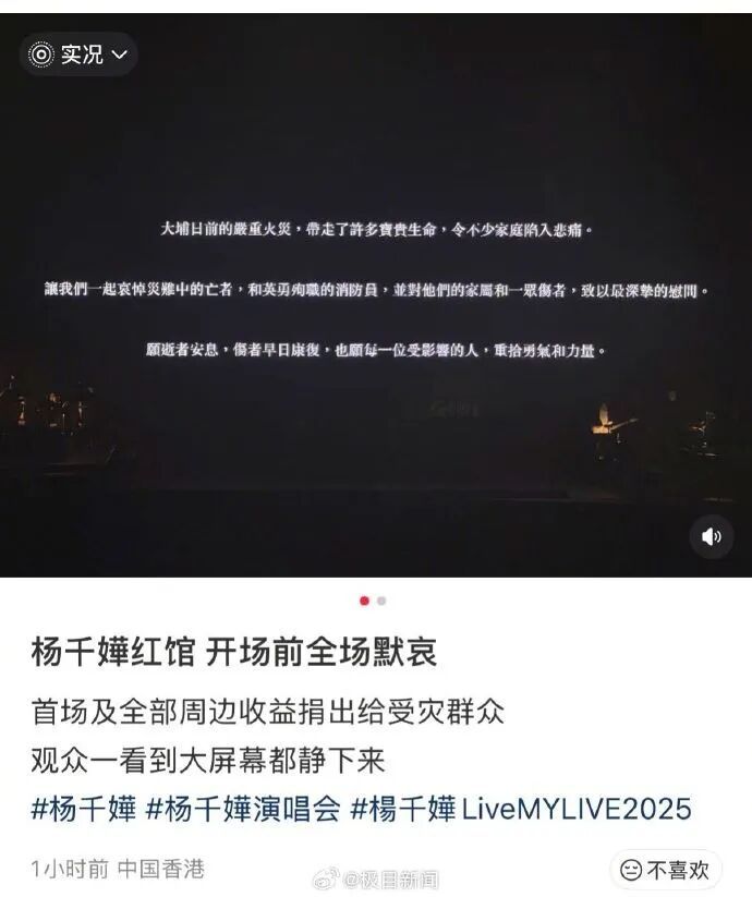 极目新闻记者注意到,演唱会于20:15开始,杨千嬅和所有台前幕后工作人员连同场馆观众一起静默一分钟,为火灾事故所有受难者致哀。