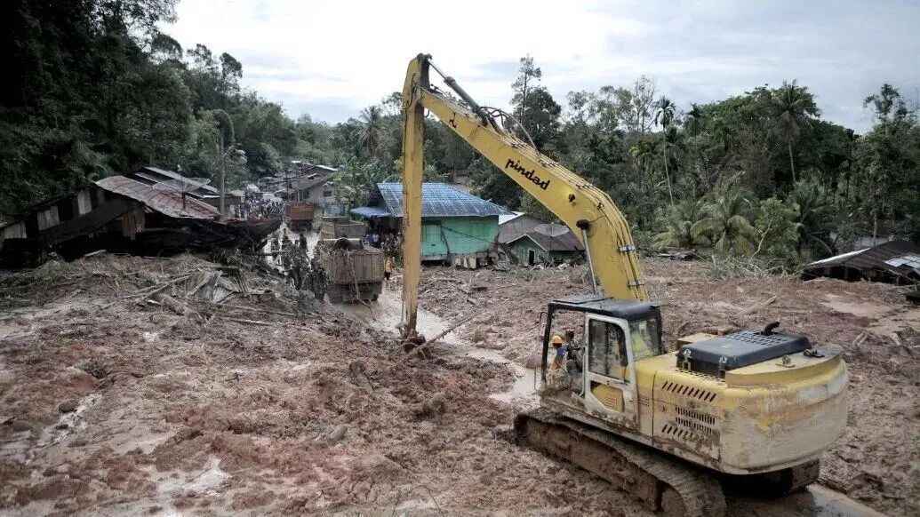 11月28日,在印度尼西亚北苏门答腊省,救援人员清理淤泥。 新华社 图