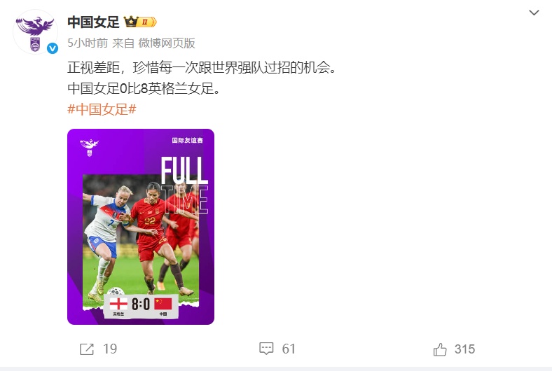 赛后,中国女足官方微博发文:正视差距,珍惜每一次跟世界强队过招的机会。