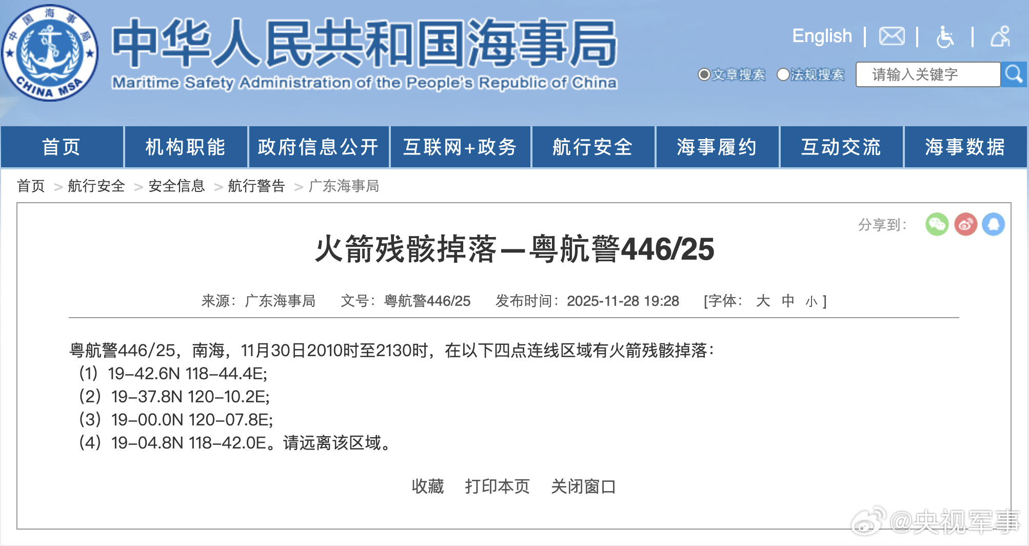 据中国海事局网站消息,广东海事局发布航行警告,11月30日20点10分至21点30分,南海部分水域有火箭残骸掉落,请远离该区域。