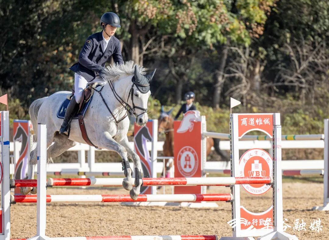 在障碍赛比赛现场,不同高度的障碍参考武汉、武汉商学院元素,地方特色浓郁。武汉商学院大一新生孔尹祥森与马匹配合默契,在高速行进中精准跨越障碍,“在自己的学校里比赛太棒了,我要尽全力赛出武汉商学院学子的风采,为学校争光。”