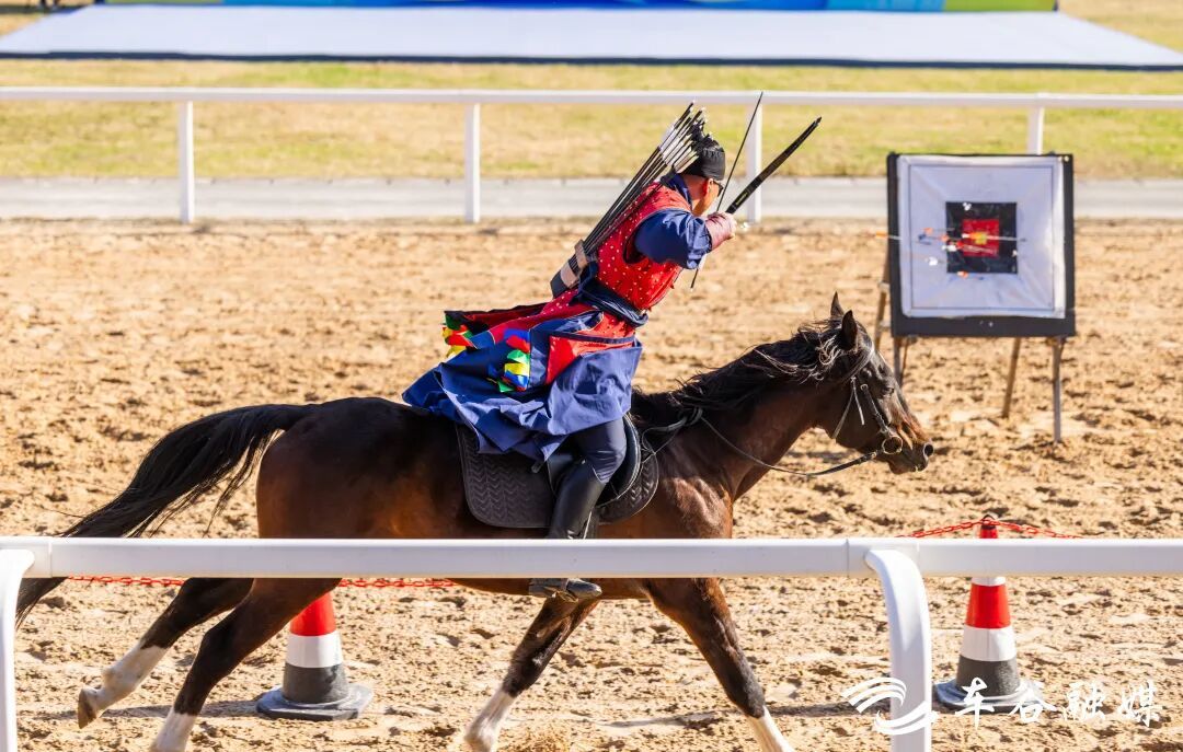 在马术表演赛现场,紧张又刺激的跑马射箭正在上演。22位全国顶尖骑手身骑骏马,飞驰通过箭靶,只见骑手们拉弓、射箭一气呵成,箭矢稳稳命中靶心,引得观众阵阵喝彩。