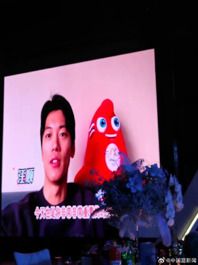 游泳运动员汪顺也录制了婚礼祝福视频,他背后还出现了巴黎奥运会的吉祥物。